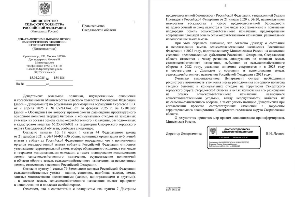 Среда, 16 апреля, 17.01 Федеральный Минсельхоз снова выступил против размещения мусорного полигона на сельхозземлях Сысертского района