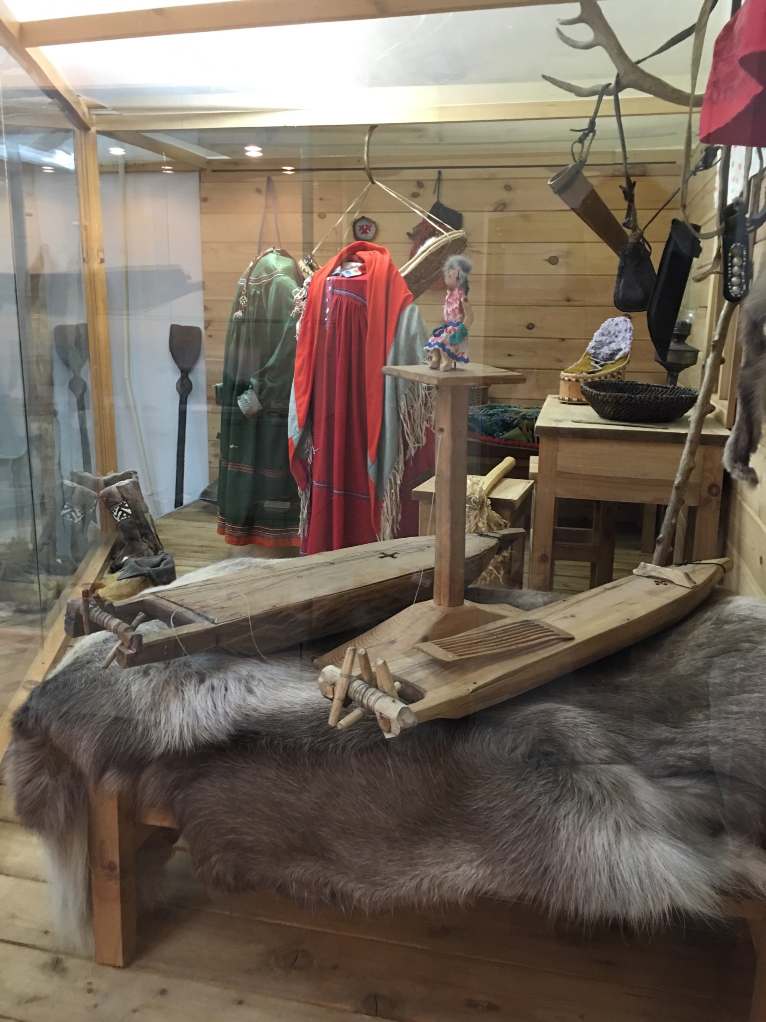 Думаю, что отдельная гордость этого музея - зал этнографии, посвященный коренным народам северного Урала, манси. Здесь и археологические находки с мест древних поселений: идолы, стрелы, подвески, обломки посуды. А так же одежда и бытовые вещи, привезённые из экспедиций. Каждая вещь имеет свою историю. Вот как, к примеру, мансийский посох, его нашли в лесу, посчитали за шаманский и даже пытались сжечь, чтобы беды не накликать. Специалисты определили посох, как сватовской. Эта вещь, тёмной мистической нагрузки не несла, а входила в предсвадебный обряд. Просватанная девушка в знак согласия накидывала на посох платок.