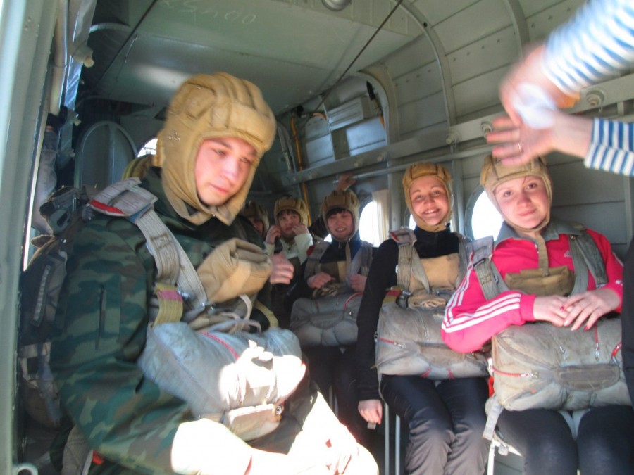 Все, остался последний шаг, сесть в самолет и взлетать. Вроде страшно, а вроде уже и нет. Страх чего-то нового и неизведанного, и это пугало больше всего. Вот мы уже в самолете, сели по пять человек на каждую сторону, я сидела во второй пятерке, но первой по счету. Инструктор в самолете читает последние рекомендации, которые я запомню на все свою жизнь: «Вы все знаете и всему научены, не стоит бояться, все будет хорошо. После красного сигнала подходите к краю и после слова «Пошел!» выпрыгиваем. Не стоит упираться, иначе мне будет сложно с вами бороться, а громко с криком «Мама!» летим вперед». Вот теперь мне стало по-настоящему страшно, после его слов, после слова «мама». Но что-то решать уже поздно, мы набираем высоту.