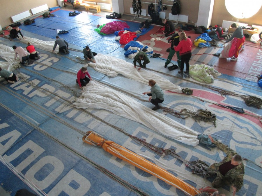 Вокруг царила странная атмосфера. Кто-то уже совершил свой прыжок и радуется, а кто-то в страхе готовится к нему. Для начала меня отправили на укладку парашюта Д-6. Укладка проходит в три этапа. После каждого из них проходит инструктор и проверяет правильность. В первом этапе требовалось уложить сам купол, взяв его в руки, я обнаружила, что на нем большая дыра. Немедленно побежала к инструктору и сообщила о том, что мой купол рваный. После осмотра главного я услышала в ответ: «Это нормально, продолжай укладку». Мне становилось все страшнее и страшнее, все больше мучил вопрос: может, не надо? Укладывать парашют желательно вдвоем, это в разы ускоряет процесс. Оставшиеся два этапа прошли успешно, хоть и потребовалось на это больше часа.