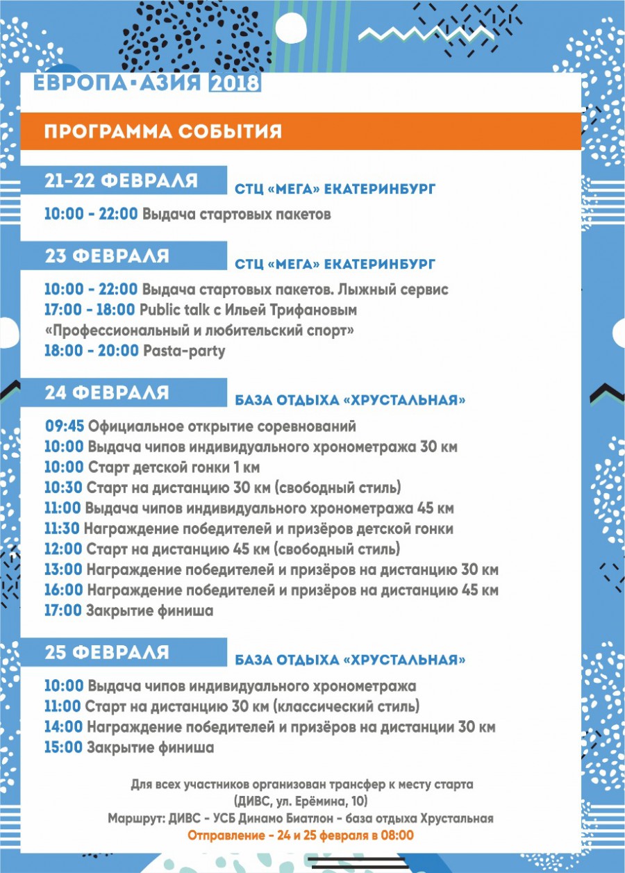 В эти выходные пройдет XXXV Традиционный международный лыжный марафон «Европа — Азия». 24 февраля состоятся заезды на 30 и 50 километров свободным стилем, 25 февраля участников будет ждать дистанция на 30 километров классическим стилем. Для детей подготовили маршрут протяженностью 1 км. Также пройдут соревнования по лазерному биатлону.