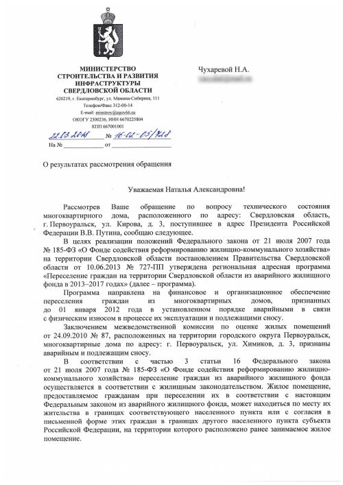 Жительница Первоуральска Наталья Чухарева, отказывающаяся переезжать в новостройку в микрорайоне Динас, обратилась для решения своих жилищных проблем в Администрацию Президента РФ и в Министерство строительства и развития инфраструктуры Свердловской области и получила неожиданные ответы. Оказалось, что, по информации администрации городского округа Первоуральск, семья Чухаревых уже переселена в новую квартиру.