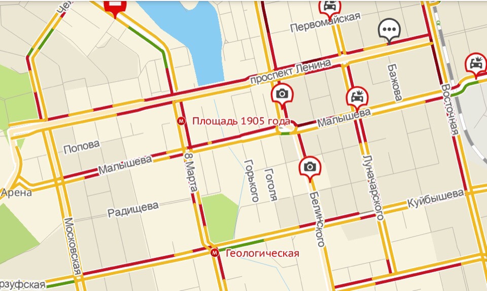 Самыми загруженными оказались проспект Ленина, улицы Луначарского, Малышева, Куйбышева и 8 Марта. Также большие пробки образовались на Фурманова, Щорса, Смазчиков, Серафимы Дерябиной, Карла Либкнехта и Первомайской.