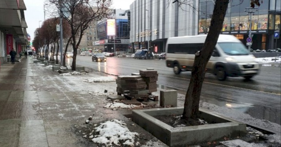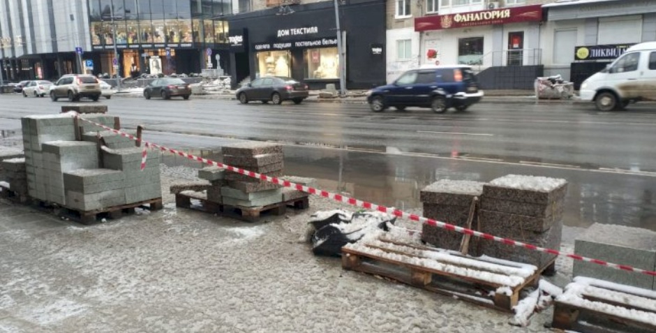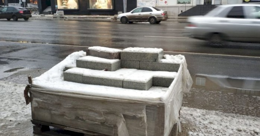 В столице Урала ещё не закончены работы по благоустройству тротуаров. Жители города обращают внимание на горки гранитной плитки, которые оказались припорошены снегом.