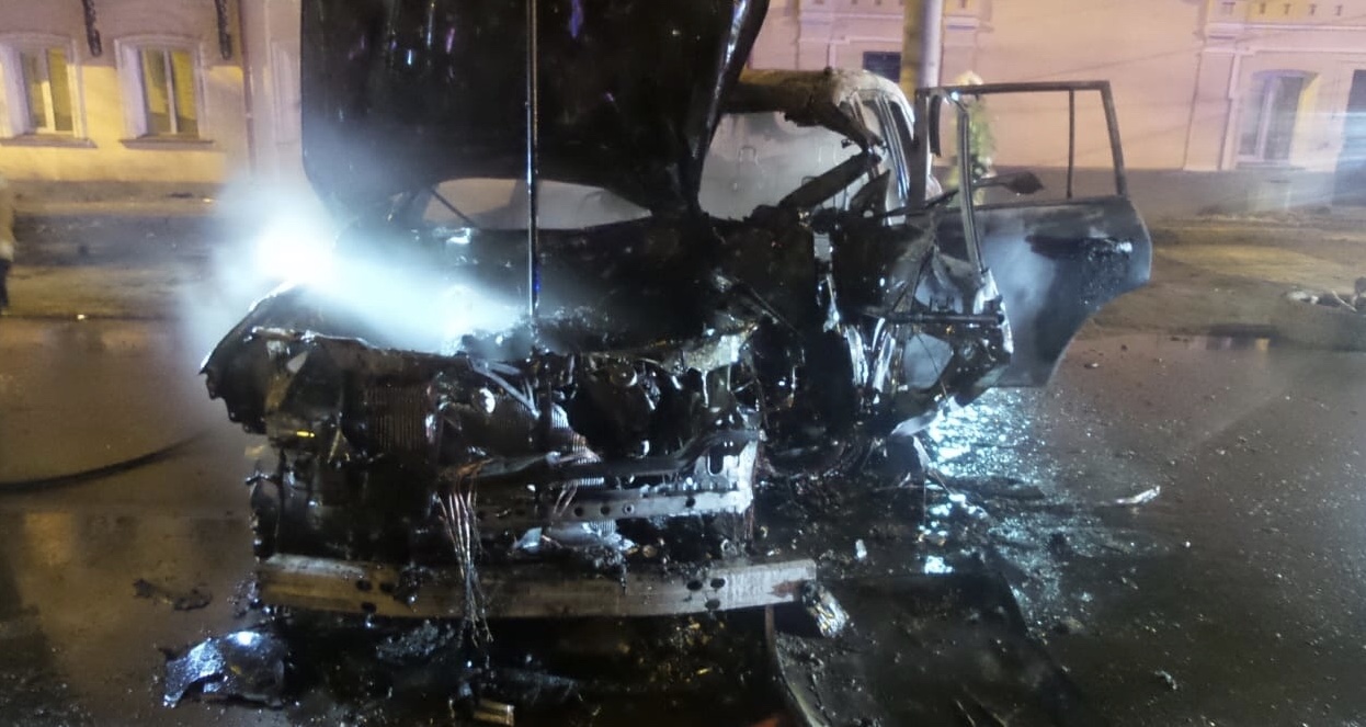 Автомобиль отлетел метров на 100 к парковке возле здания городской прокуратуры, врезался в опору троллейбусной линии, после чего загорелся. Внутри находились два человека – водитель и пассажирка. Мужчину из-за руля вытащили очевидцы. С серьёзными ожогами он доставлен в больницу № 23. Женщина-пассажирка скончалась. Её обгоревшее тело долго не могли достать из машины.