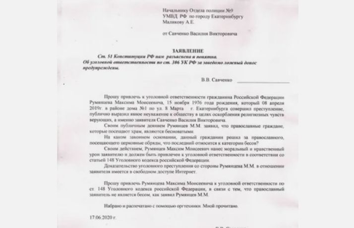 Юрист из Екатеринбурга подал в отдел полиции №9 заявление на православного журналиста Максима Румянцева. Василий Савченко просит проверить высказывания репортера, прозвучавшие во время протестов 7 апреля прошлого года, на наличие оскорблений чувству верующих.