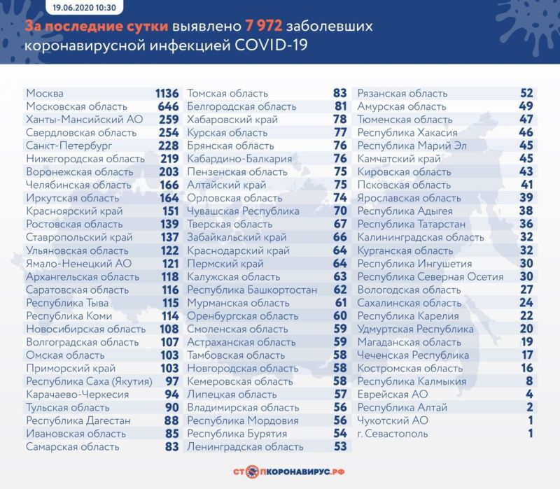 За минувшие сутки в России подтвердили 7 972 случаев коронавируса в 83 регионах страны. Из них 2 610 случаев (32,7%) выявлены активно у контактных лиц без клинических проявлений болезни. Всего в стране зарегистрированы 569 063 заболевших в 85 регионах.