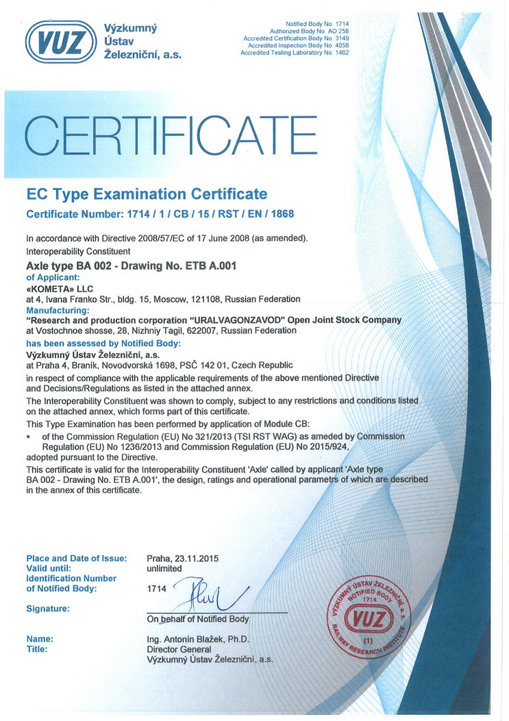 Научно-производственная корпорация «Уралвагонзавод» начинает производство чистовых осей двух типов – BA-002 и BA-302 – с нагрузкой 25 тонн для подвижного состава европейской колеи шириной 1435 мм. Их полное соответствие европейским стандартам подтверждено сертификатом чешского сертификационного центра VUZ.