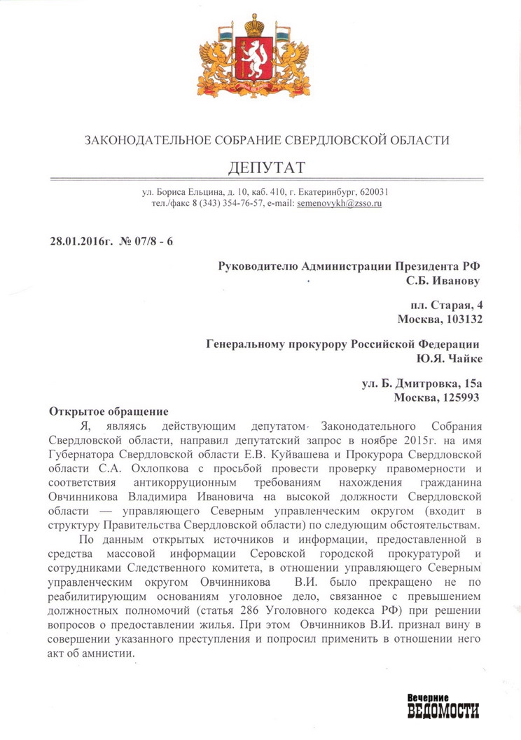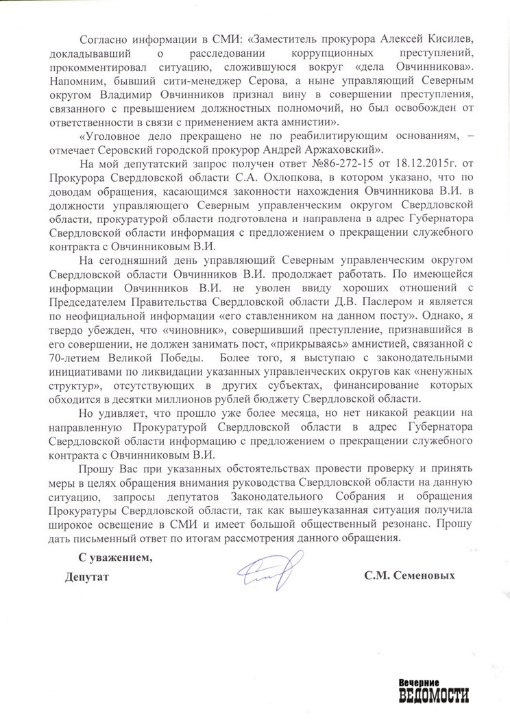 «На сегодняшний день управляющий Северным управленческим округом Свердловской области Овчинников В.И. не уволен ввиду хороших отношений с Председателем Правительства Свердловской области Д.В. Паслером и является, по неофициальной информации, «его ставленником на данном посту». Однако я твердо убежден, что «чиновник», совершивший преступление, признавшийся в его совершении, не должен занимать пост, «прикрываясь» амнистией, связанной с 70-летием Великой Победы. Более того, я выступаю с законодательными инициативами по ликвидации указанных управленческих округов как «ненужных структур», отсутствующих в других субъектах, финансирование которых обходится в десятки миллионов рублей бюджету Свердловской области», – отмечено в обращении Сергея Семеновых.