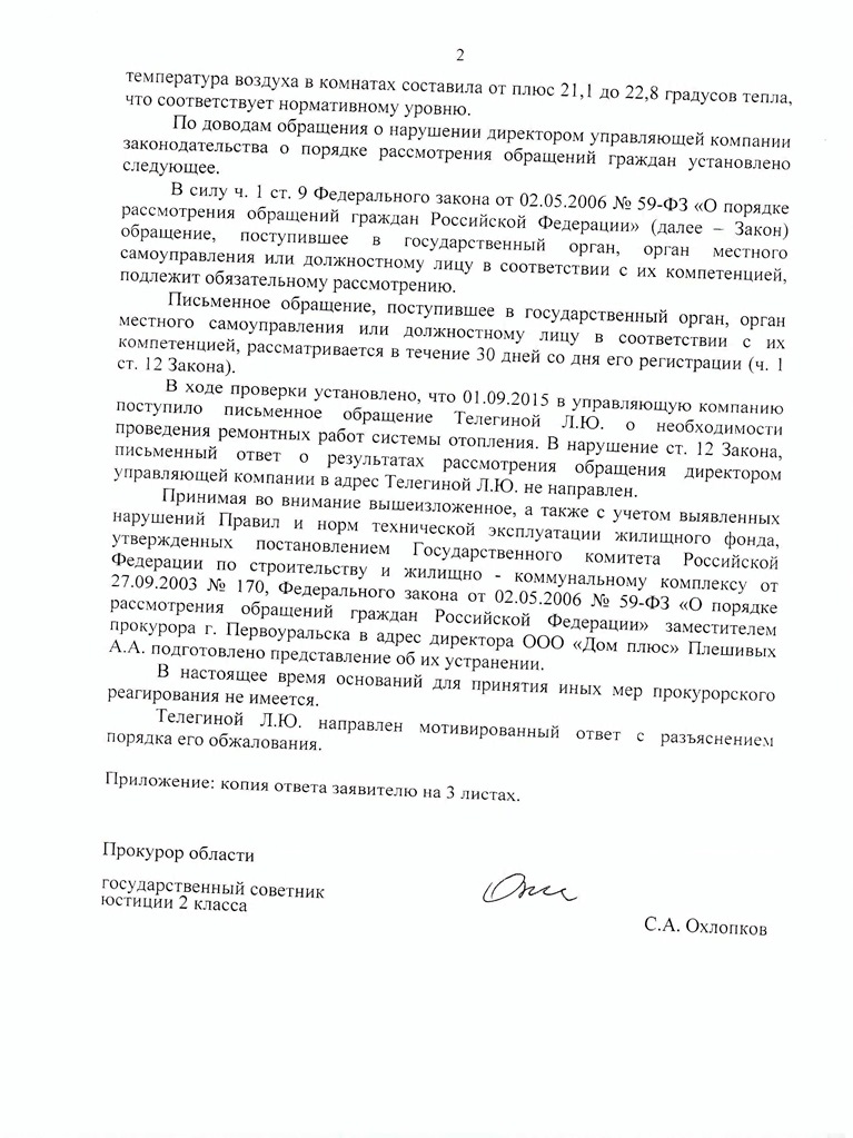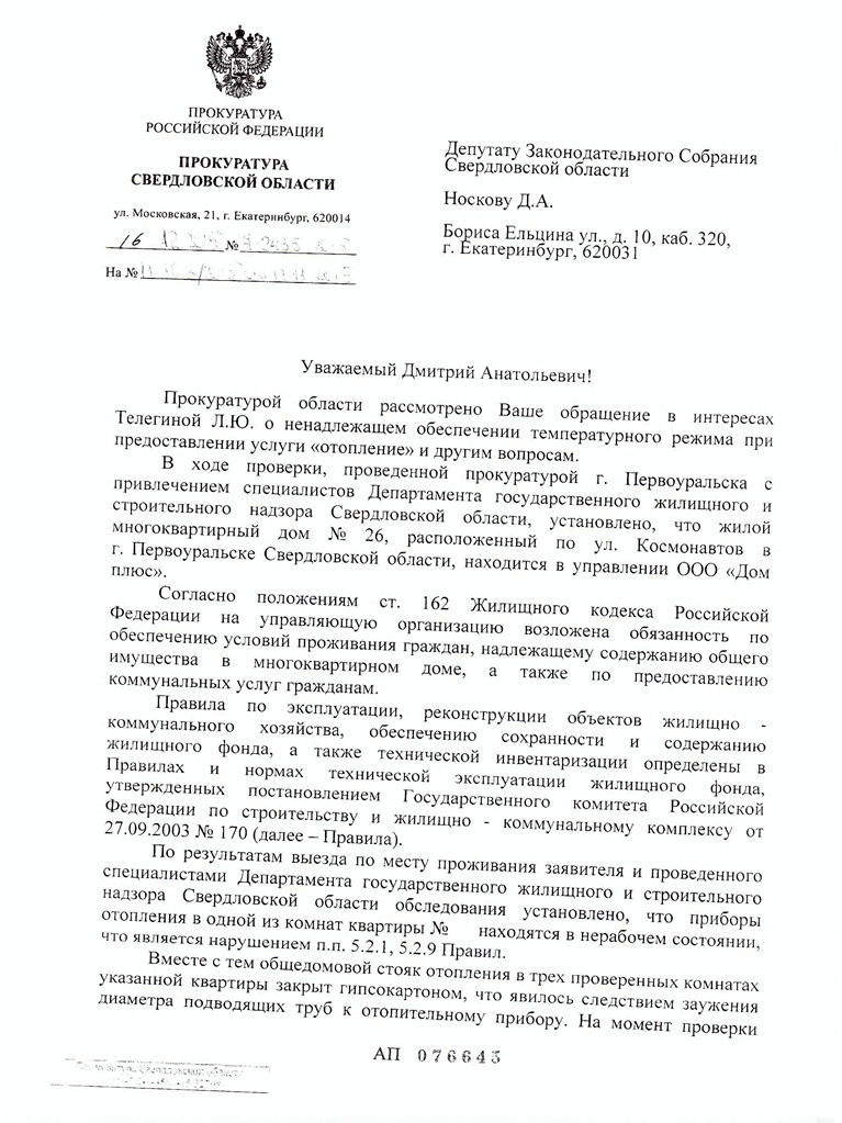 В доме № 26 на улице Космонавтов выявлено, что приборы отопления в одной из квартир дома находятся в нерабочем состоянии. Из-за чего в помещении, по словам жителей, холодно. Но управляющая компания ООО «Дом плюс» проигнорировала просьбу жильцов произвести ремонт, поэтому жителям пришлось обращаться за помощью к Денису Носкову. А он в свою очередь отправил соответствующий запрос в прокуратуру, которая и обязала директора УК устранить нарушения.