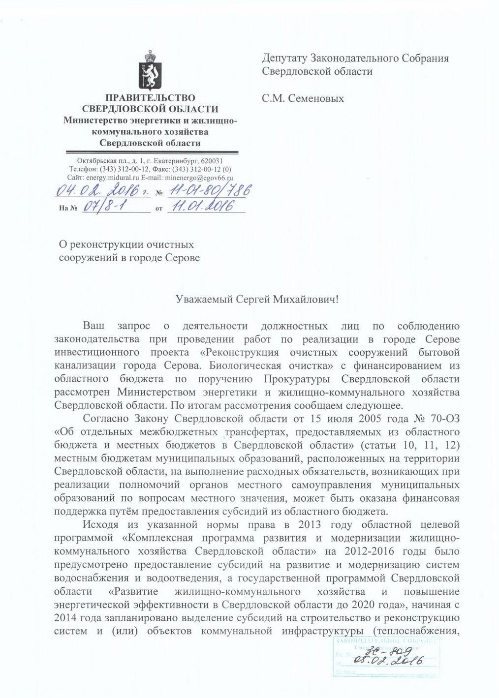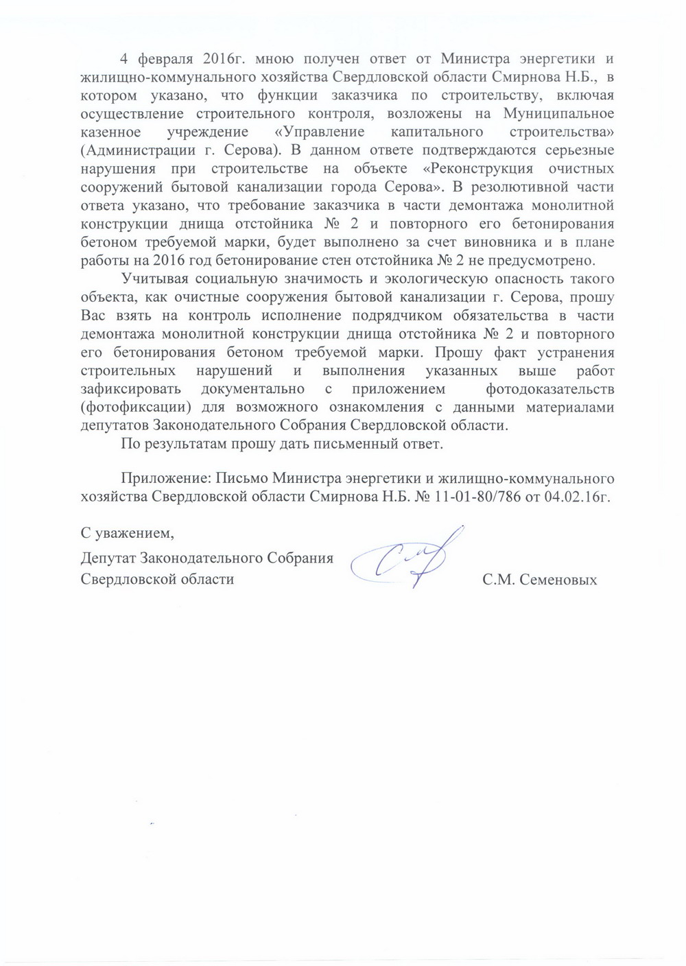 Сергей Семеновых отмечает, что в январе 2016 года он на имя областного прокурора Сергея Охлопкова направил депутатский запрос, в котором сообщал о некачественном строительстве, производимом на бюджетные средства (порядка 152 млн рублей из региональной казны и 34 млн рублей из местной), при реконструкции очистных сооружений бытовой канализации Серова. Нарушения касались работ, производимых на отстойнике № 2. Прокуратура, ознакомившись с запросом Сергея Семеновых, направила материалы дела в министерство энергетики и ЖКХ Свердловской области. На депутатский запрос ответил лично министр Николай Смирнов.