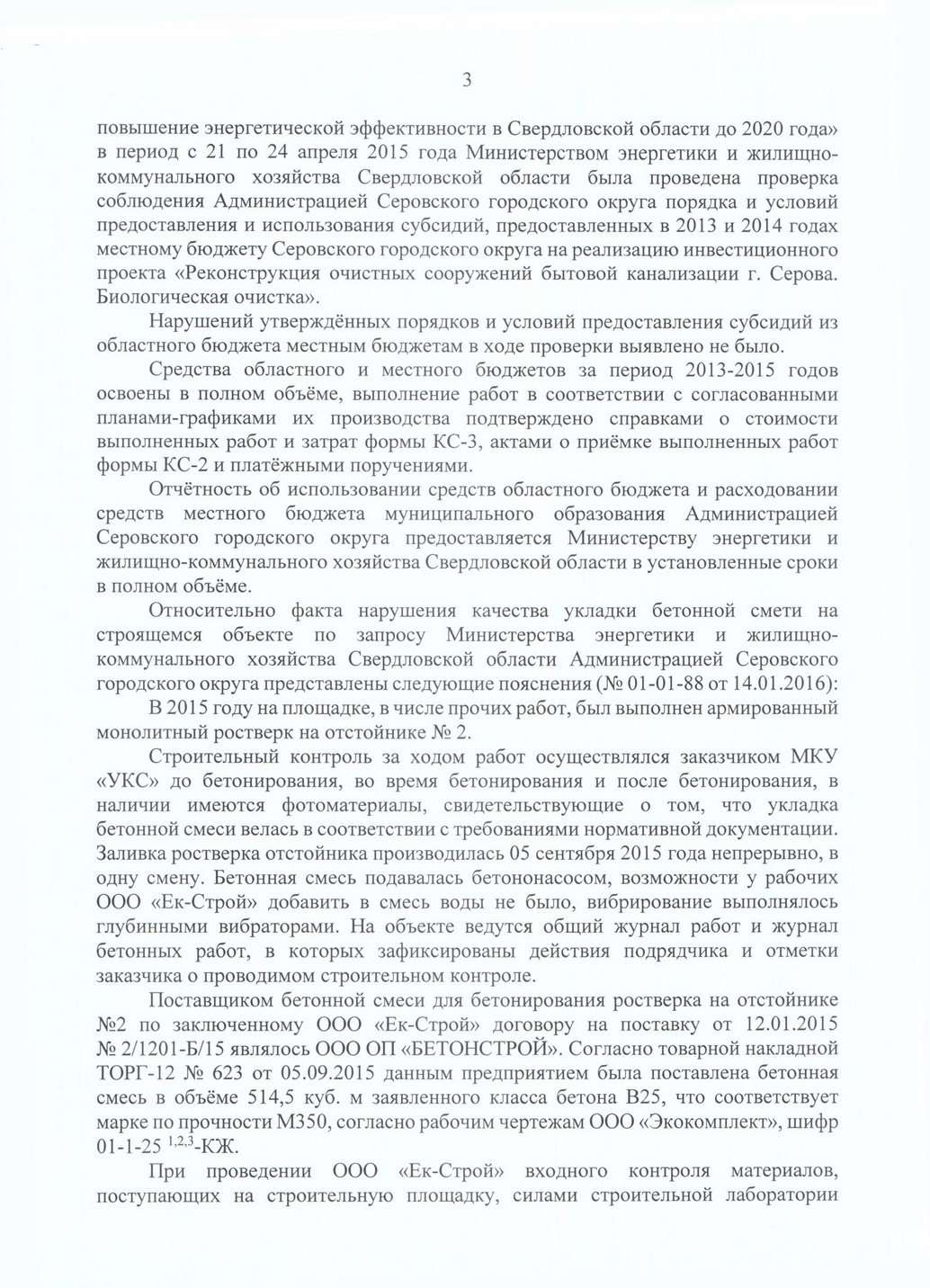 «В данном ответе подтверждаются серьезные нарушения при строительстве на объекте «Реконструкция очистных сооружений бытовой канализации города Серова». В результативной части ответа указано, что требование заказчика в части демонтажа монолитной конструкции днища отстойника № 2 и повторного его бетонирования бетоном требуемой марки будет выполнено за счет виновника», – отмечено в письме.
