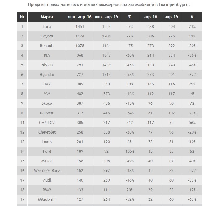 В январе – апреле 2016 года в Екатеринбурге было продано 10 185 новых легковых автомобилей. Это на 25% меньше показателя за аналогичный период прошлого года. Как сообщает агентство «Auto-Dealer-Екатеринбург», в апреле дилеры реализовали 2 749 машин, что на 20% меньше результата апреля 2015 года. Такое падение стало самым мягким по результатам одного месяца в этом году. Ранее рынок ежемесячно сокращался от 22 до 37%.