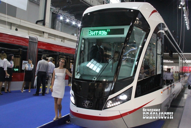 В Екатеринбурге, на выставке «Иннопром», публике и специалистам впервые показали сочлененный трамвай «Витязь-М» - это премьера московской компании «Транспортные системы».
