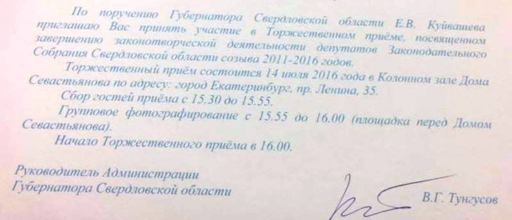 Как стало известно veved.ru, после заседания парламентариев ждут в резиденции губернатора. На днях за подписью руководителя администрации губернатора Свердловской области Владимира Тунгусова депутатам разослали приглашения принять участие в торжественном приеме, посвященном завершению законотворческой деятельности ЗССО уходящего созыва. Мероприятие состоится в Колонном зале дома Севастьянова в 16:00.