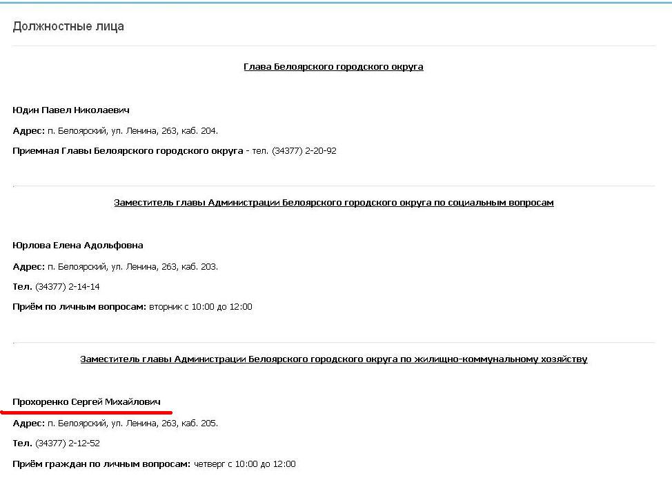 Любопытно, что главный коммунальщик Белоярки, задержанный оперативниками ФСБ в январе 2016 года, в пресс-релизах силовиков числится бывшим сотрудником мэрии. В то же время, согласно официальному порталу БГО, Прохоренко является действующим замглавы.