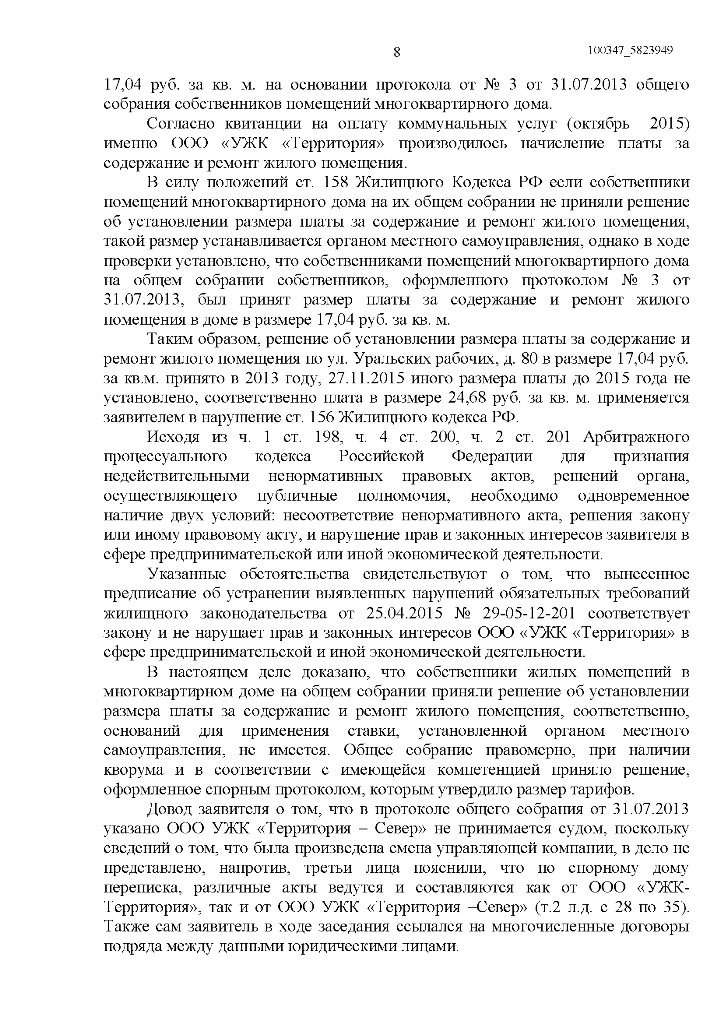 Сотрудники Департамента государственного жилищного и строительного надзора (ГЖИСН), выявив нарушения жилищного законодательства, выдали ООО «УЖК «Территория» предписание от 25 апреля 2016 года об их устранении. В соответствии с данным документом, до 15 июня УК Дмитрия Сеня должна была начислять плату по тарифу, утвержденному жителями, – по ставке 17,04 руб., а также сделать перерасчет.