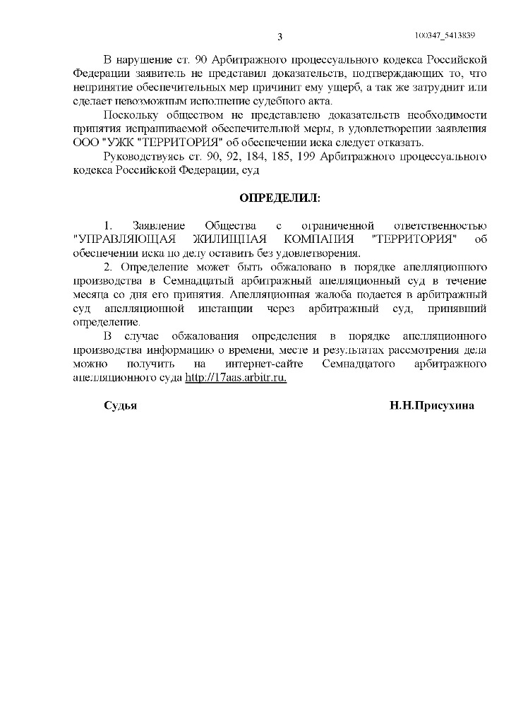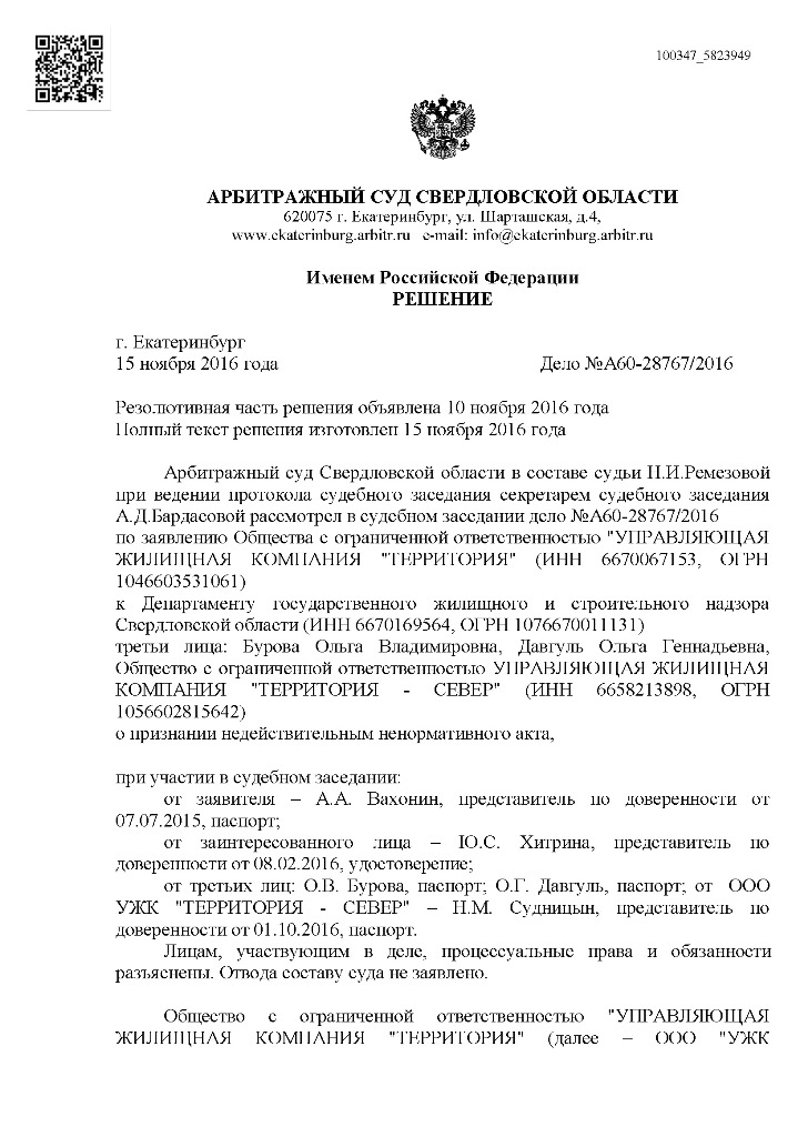 Однако «управляшка» оказалась настолько «упертой», что решила проявить смелость, граничащую с дерзостью: полагая, что предписание является незаконным и необоснованным, она обратилась в Арбитражный суд Свердловской области с требованием признать его недействительным. Более того, со стороны ООО «УЖК «Территория» поступило ходатайство о приостановлении действия предписания на момент судебного разбирательства, но было отклонено по решению судьи Присухиной.