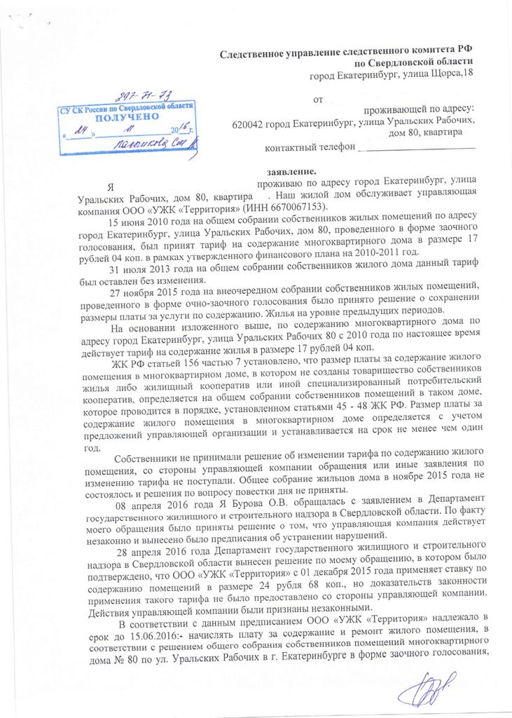 «ООО «УЖК «Территория» в лице директора Сень Д.В. действует в своих корыстных целях и извлекает выгоды для себя лично. В настоящее время перерасчет не произведен… Я полагаю, что руководитель ООО «УЖК «Территория» незаконно присваивает чужие денежные средства в личных целях вопреки воли граждан – жильцов дома, что можно инкриминировать как присвоение, то есть хищение чужого имущества, вверенного виновному…» – значится в обращении к правоохранителям (в распоряжении редакции имеются копии всех документов).