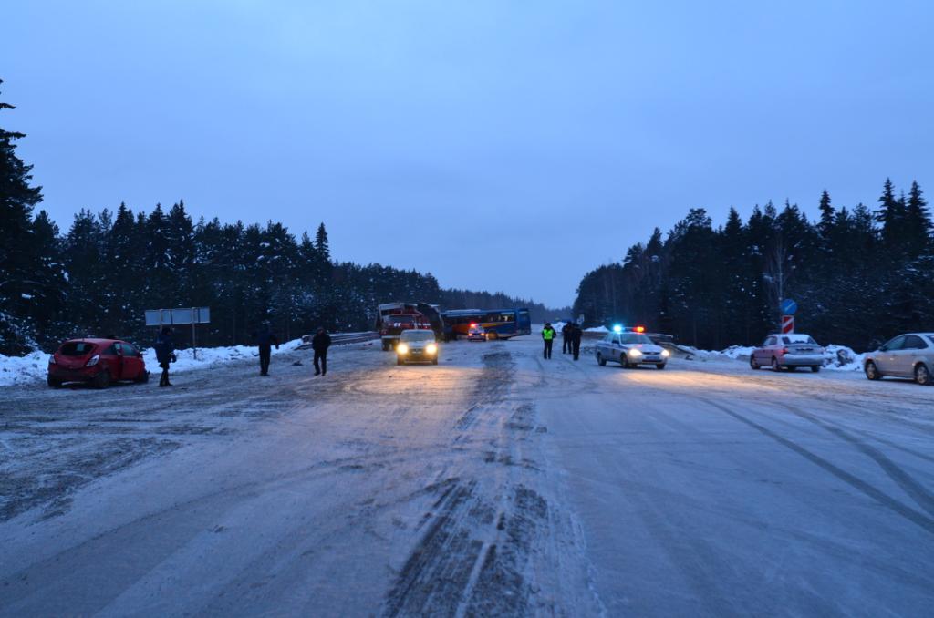 Кроме автобуса и иномарки, в ДТП попали фуры «Вольво» и «Рено», следовавшие со стороны Перми. По предварительным данным, в аварии травмы различной степени тяжести получили 10 человек, из них 8 – пассажиры автобуса. Среди пострадавших есть 16-летняя девочка.