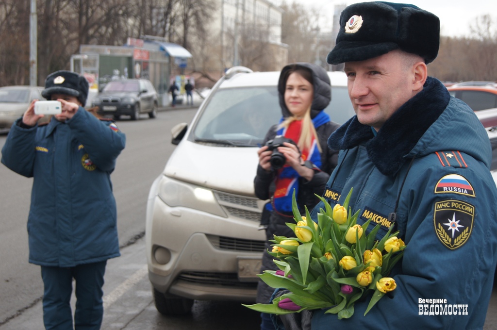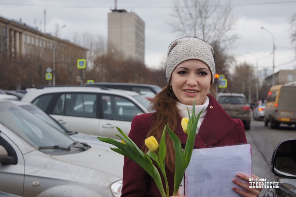 В Екатеринбурге сотрудники ГИБДД совместно с представителями МЧС поздравляют автомобилисток с Международным женским днем. Они подготовили для автоледи весенние цветы и автомобильные огнетушители. Одной из площадок, где дамам-водителям раздавали разноцветные тюльпаны, стала площадь имени Кирова – напротив главного корпуса УрФУ.