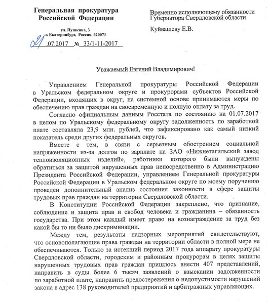 Заместитель генпрокурора Юрий Пономарев направил обращение Евгению Куйвашеву в связи с обострением ситуации по выплате зарплат на предприятиях