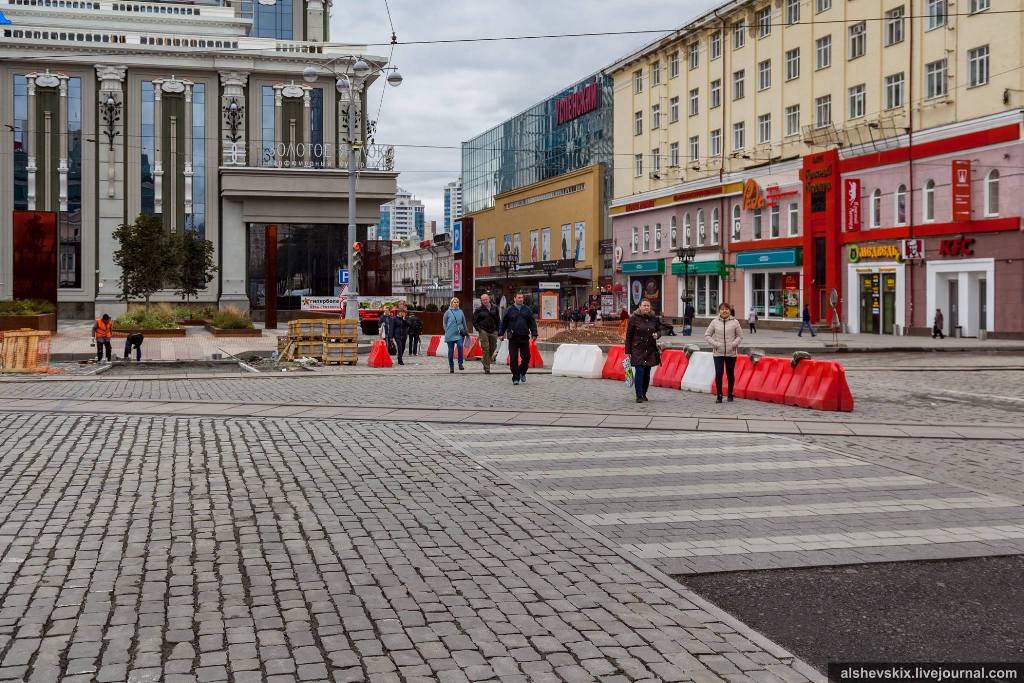 Как пояснял ранее заместитель председателя комитета по благоустройству администрации Екатеринбурга Виктор Юровицкий, рабочие выполняют переукладку гранитной брусчатки — это делается для устранения разрушений брусчатки, вызванных прохождением тяжелой техники: ежегодно в День Победы здесь проходит военный парад.