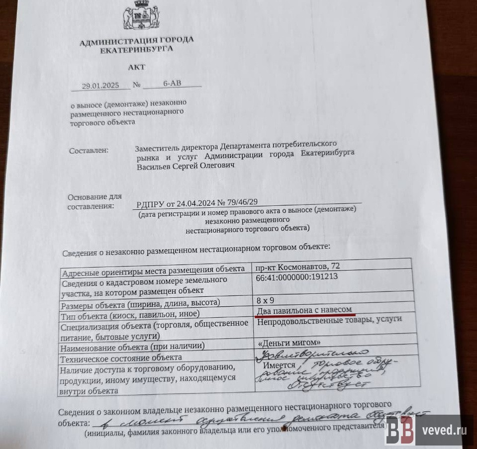 В акте демонтированный объект описали как «Два павильона с навесом»
