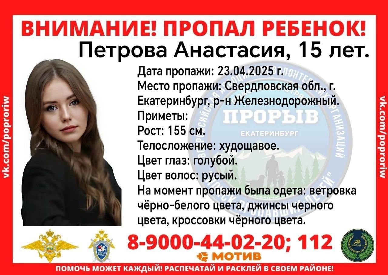 Вторая – 15-летняя Анастасия Петрова, пропавшая в прошлую среду. Девочка ростом 155 сантиметров, худощавого телосложения, с голубыми глазами и русыми волосами. На момент пропажи была одета в чёрно-белую ветровку, чёрные джинсы и чёрные кроссовки.