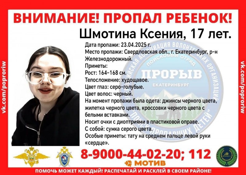 Третья – 17-летняя Ксения Шмоткина, также пропавшая неделю назад. Её рост 164-168 сантиметров, телосложение худощавое, волосы черные, а глаза серо-голубые. Была одета в чёрную жилетку, чёрные джинсы и чёрные кроссовки с белыми вставками. С собой у неё была серая сумка. Из особых примет – тату на среднем пальце левой руки в виде сердца. Носит очки с диоптриями в пластиковой оправе.