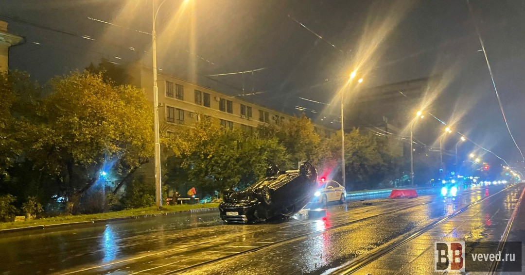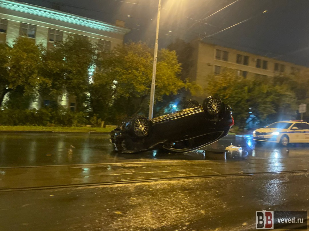 Автомобиль перевернулся в Екатеринбурге, перекрыв трамвайное движение по улице Малышева