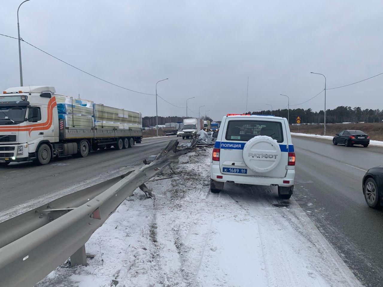 Вторая авария была зарегистрирована на 31-м километре трассы Екатеринбург – Тюмень, где «МАЗ» не только снёс ограждение, но и столкнулся с двумя легковыми автомобилями. К счастью, обошлось без пострадавших.