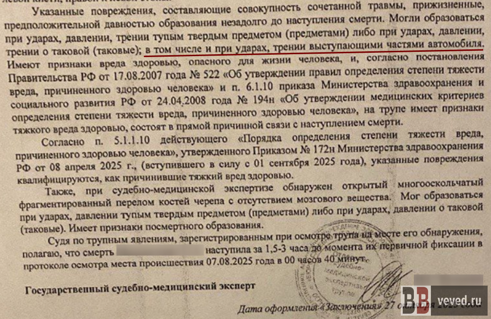 Вторая версия второй судебно-медицинской экспертизы — в ней уже добавлено «автомобиль» на последней странице. Кстати, её делали уже 29 октября, а дата всё та же, что и на первом варианте — 27 октября. Может, есть ещё какая-то третья или четвёртая версия второй СМЭ. Но мне неизвестно. Следователь полиции просил вернуть последнюю страницу первой версии второй экспертизы,