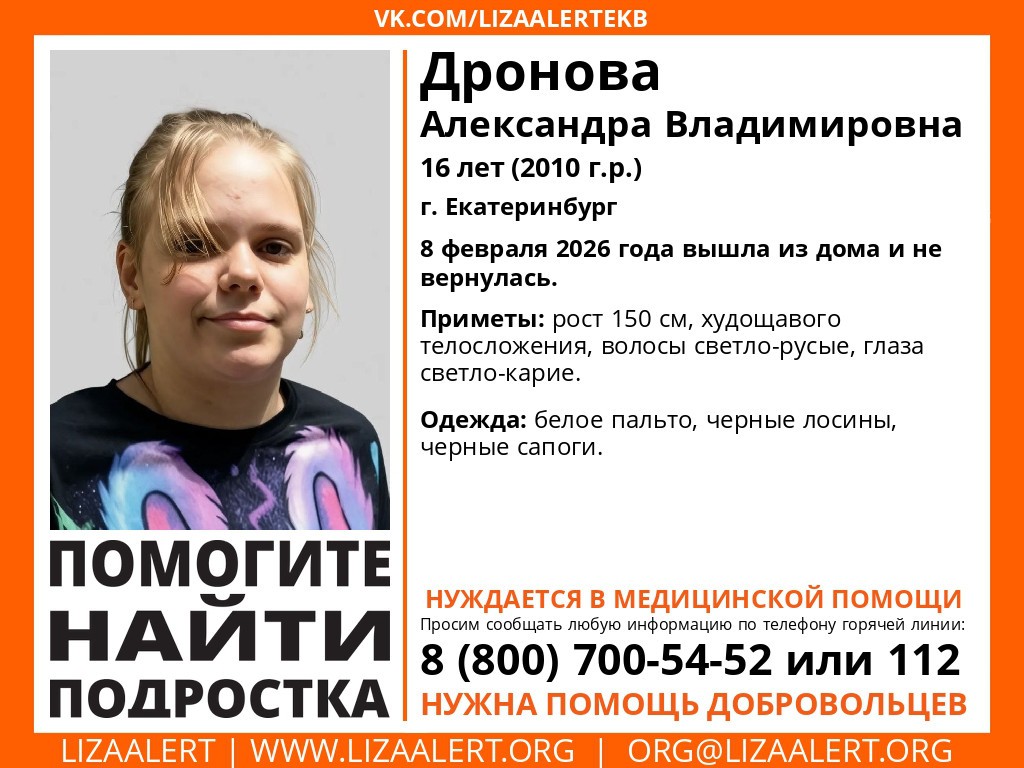 Поисковый отряд «ЛизаАлерт» Свердловской области сообщил о пропаже 16-летней Александры Дроновой. Девушка сегодня вышла из дома и до сих пор не вернулась.