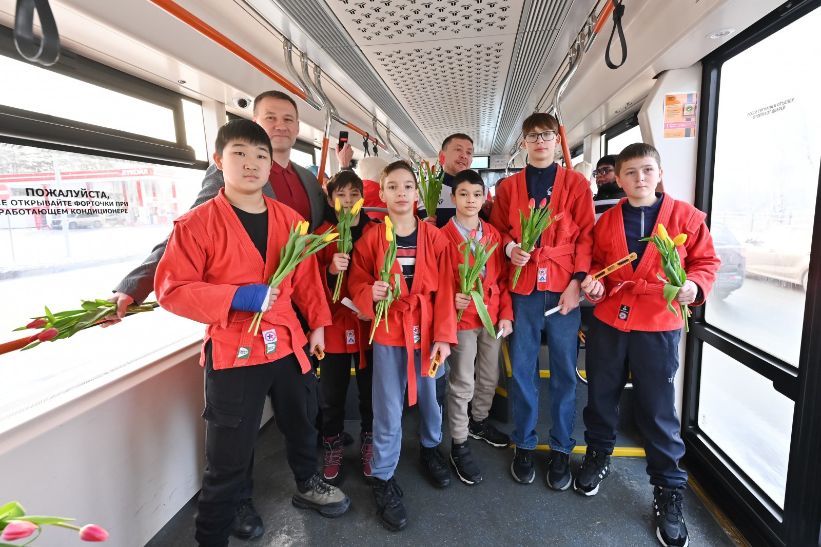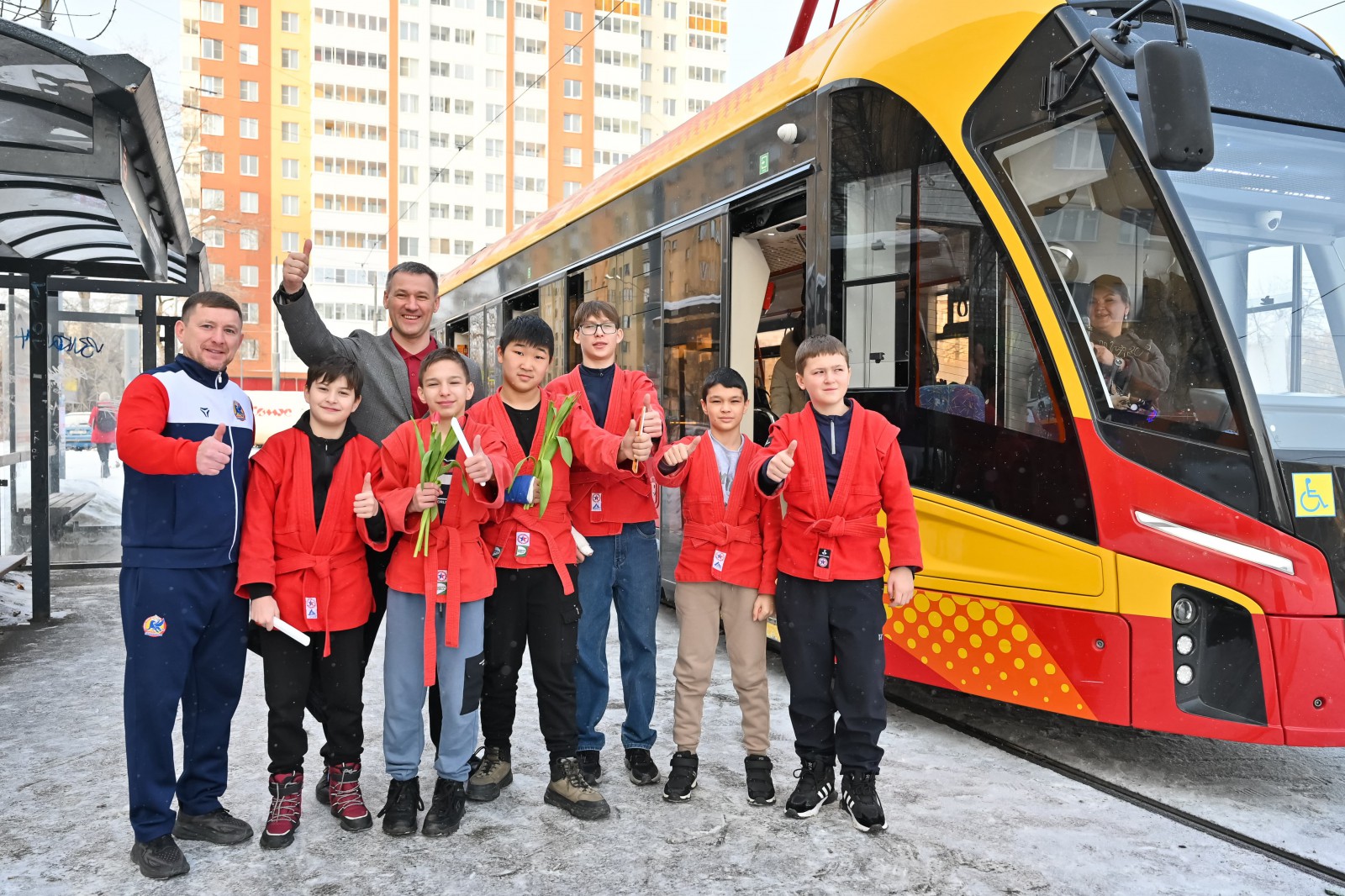 В преддверии 8 Марта двукратный чемпион мира по самбо, директор СШ «Единоборств» Тимур Галлямов, депутат областного Заксобрания, координатор проекта «Выбор сильных» в Свердловской области Алексей Свалов вместе с воспитанниками спортивной школы прокатились на верхнепышминском трамвае, чтобы поздравить пассажирок, в том числе самых юных, и вручим им по букету тюльпанов и памятному подарку от «Верхнепышминский трамвай» – светоотражающий браслет.