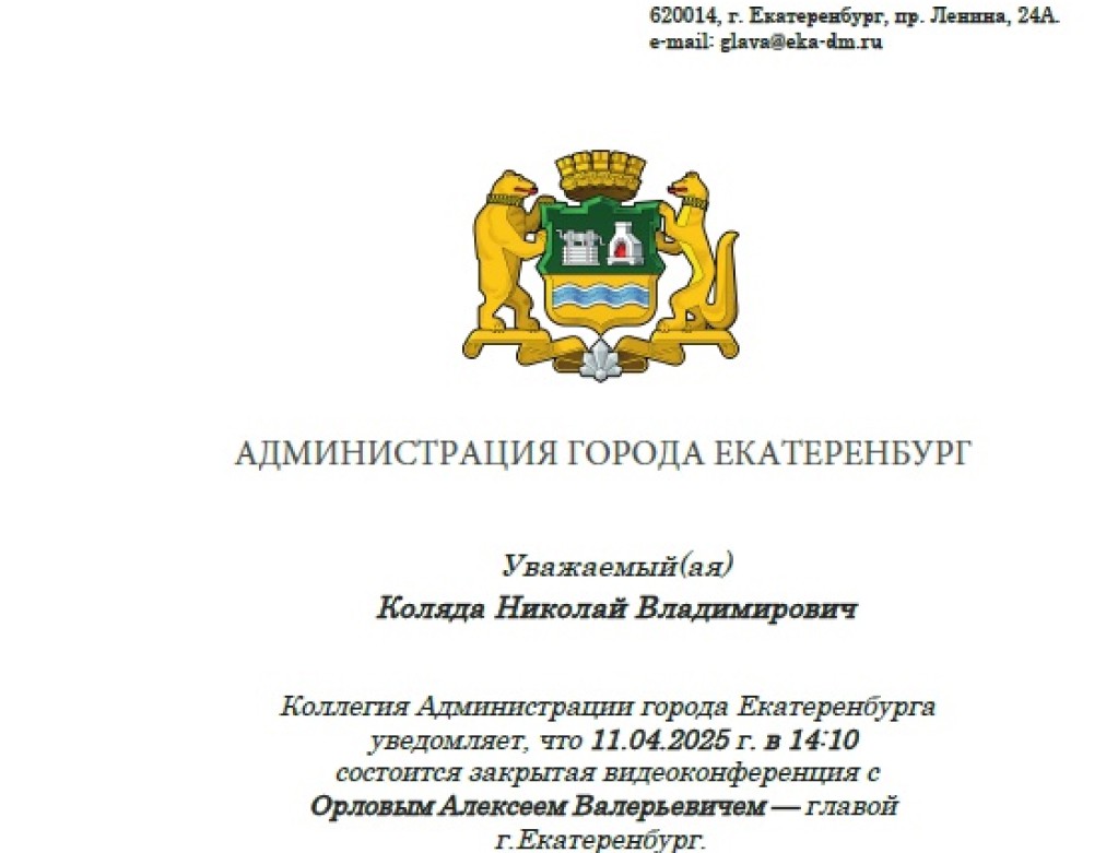 Уральского режиссёра и драматурга Николая Коляду попытались обмануть мошенники. Как он рассказал в своих соцсетях, 11 апреля ему позвонила неизвестная девушка, представившаяся сотрудницей администрации Екатеринбурга. Она сообщила, что мэр города Алексей Орлов хочет провести с ним видеоконференцию, и прислала соответствующий «официальный» документ.