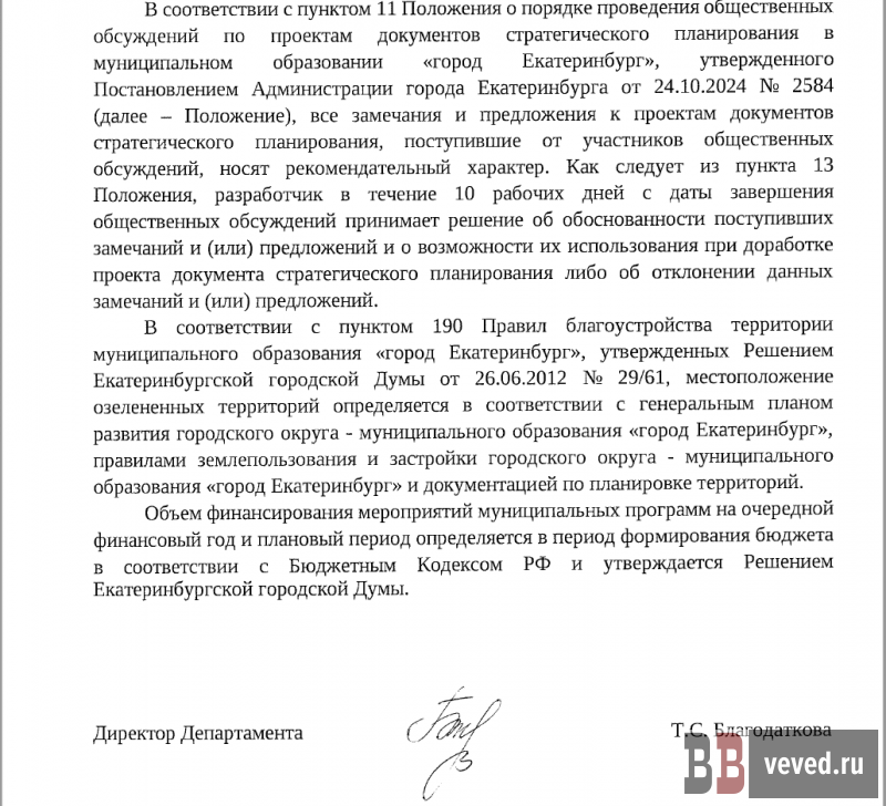 Вечерние ведомости сделали запрос в администрацию и получили ответ за подписью директора департамента благоустройства Тамары Благодатковой.
