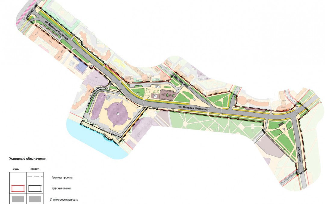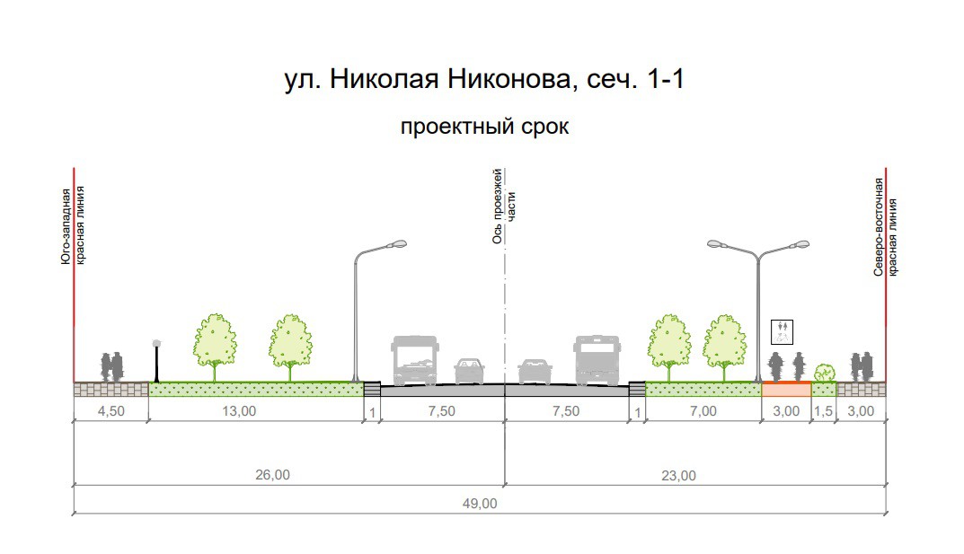 После реконструкции длина улицы должна составить 1 км, ширина проезжей части – 15 м, тротуаров – от 3 до 4,5 м, кроме того, на Никонова обустроят велодорожки шириной от 2,5 до 3 м. На перекрёстке улицы Никонова и переулка Красного планируют установят светофор, а часть сквера имени Александра Канделя придётся вырубить.