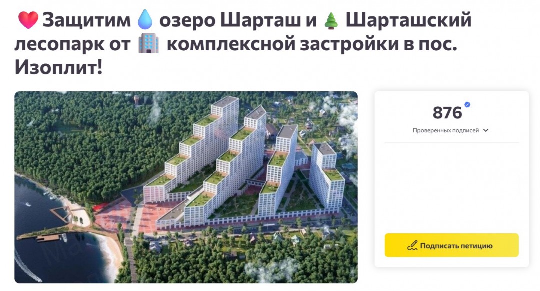 В Екатеринбурге объявили сбор подписей под петицией против застройки посёлка Изоплит на берегу Шарташа, которую планирует в этом месте «Атомстройкомплекс».