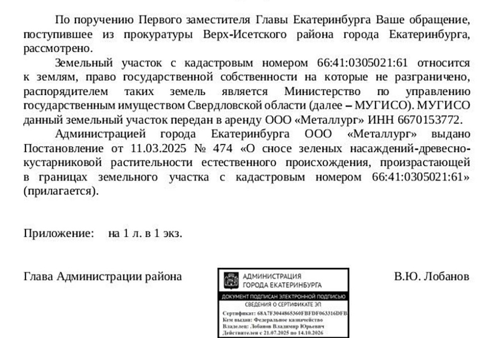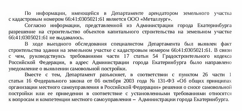 При этом в обоих ответах райадминистрация упорно отказывалась дать ответы на вопрос «почему строительство ведётся без ограждений, без паспорта объекта и в слишком поздние часы, когда жители пытаются отдохнуть от дневной суеты». А ответ, похоже, кроется в том, что никакого разрешения на работы и не выдавалось. По крайней мере, это следует из ответа от департамента государственного и жилищного надзора Свердловской области, где подтверждается, что собственник участка — ООО «Металлург». Вот только разрешений на капитальное строительство чего-либо коммерческой структуре не выдавалось. Соответственно, в этом «департаментском» ответе появление здания на данном участке названо «самовольной постройкой».