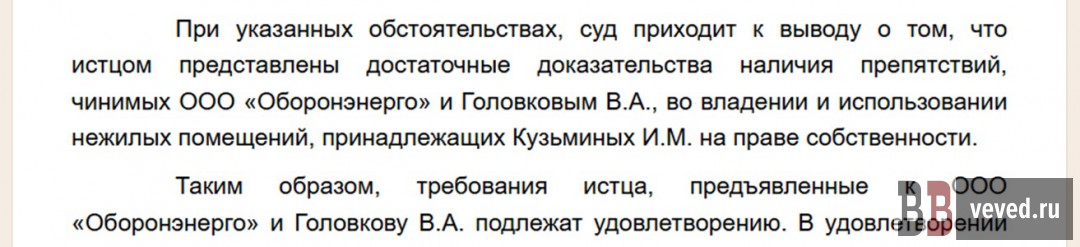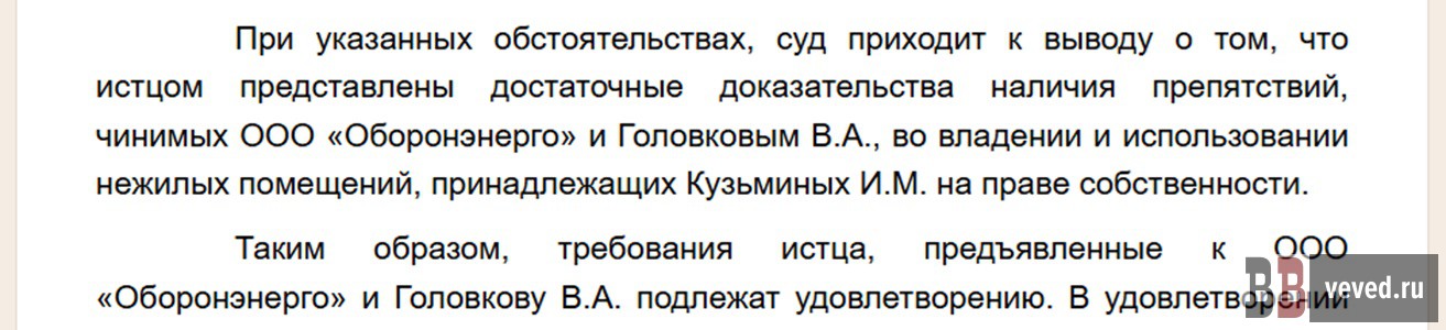 Уже 11 июля 2023 года тем же судом было удовлетворено требование Кузьминых об устранении препятствий в пользовании помещениями: суд установил, что представители ООО «Оборонэнерго» и лично Головков препятствовали собственнику в доступе к его имуществу.