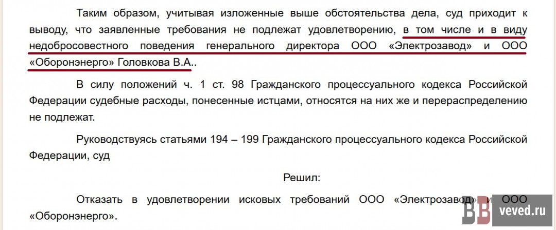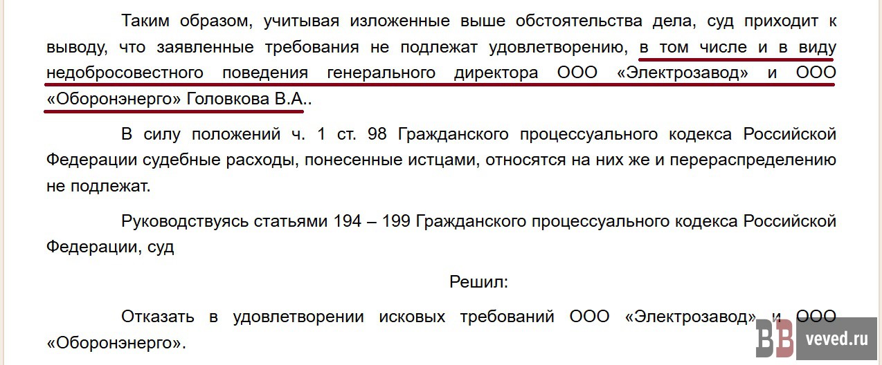 А 8 апреля 2024 года тем же судом рассматривался встречный спор между ООО «Электрозавод», ООО «Оборонэнерго» и Кузьминых. В этом процессе суд отказал в требованиях о признании договора аренды незаключённым или недействительным, указав, что стороны фактически исполняли договор и подтвердили его действие. При этом суд отдельно отметил недобросовестность поведения руководства ООО «Электрозавод» и ООО «Оборонэнерго», действовавших под управлением одного лица, и указал на злоупотребление правом. Таким образом, раз за разом гражданские суды фиксировали правовые обстоятельства, не подтверждающие позицию Головкова и связанных с ним юридических лиц.