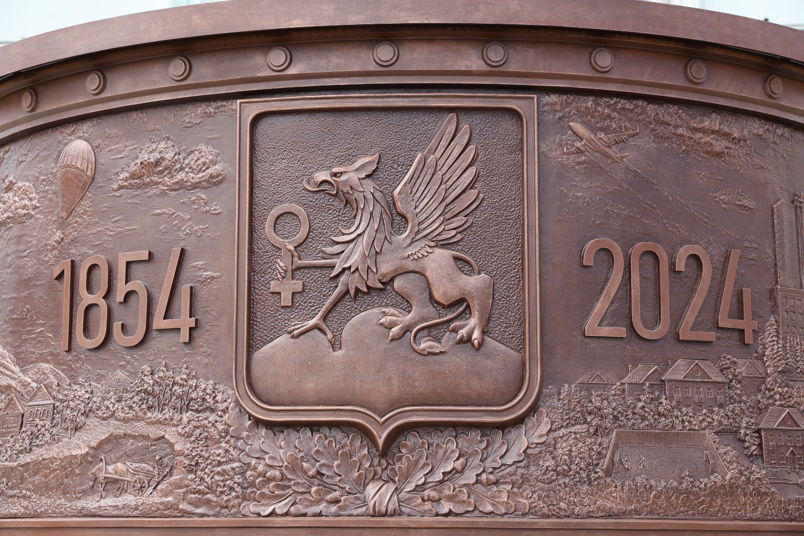 В центре барельефа – герб Верхней Пышмы. Слева и справа от него даты – 1854 и 2024, символизирующие 170-летие города. Остальное пространство занимают важные этапы истории города – вывоз руды на лошадях, деревянные копры старых шахт, здания основных цехов градообразующего предприятия, дворец культуры, храм Успения, музей, театр, трамвай, многоэтажная застройка.