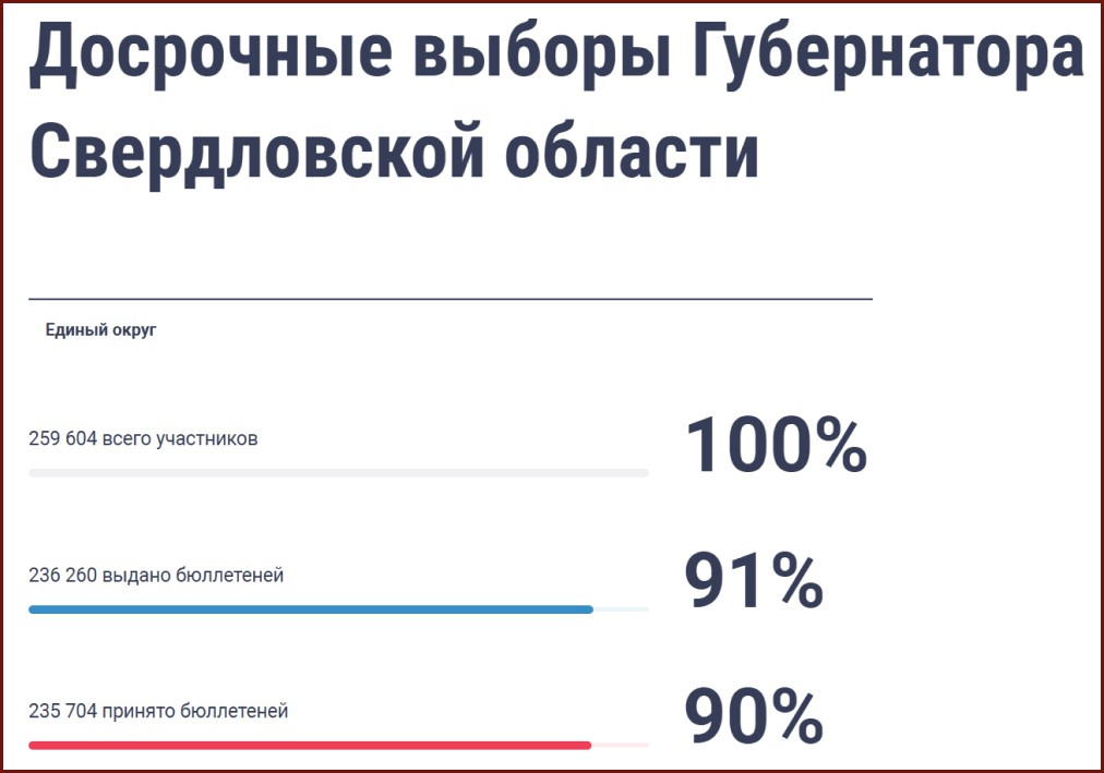 Воскресенье, 14 сентября, 18.02 В Свердловской области явка на выборах губернатора через ДЭГ достигла 91%
