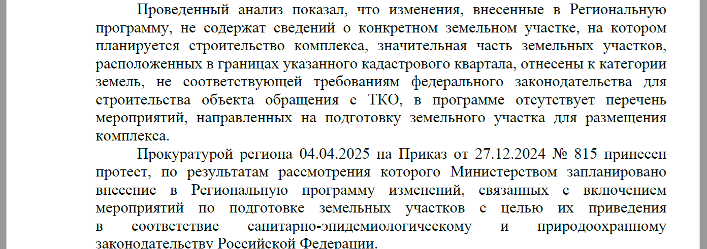 Как установило ведомство, изменения, внесенные в Схему по обращению с ТКО, «не содержат сведений о конкретном земельном участке, на котором планируется строительство комплекса, значительная часть земельных участков, расположенных в границах указанного кадастрового квартала, отнесены к категории земель, не соответствующей требованиям федерального законодательства для строительства объекта обращения с ТКО, в программе отсутствует перечень мероприятий, направленных на подготовку земельного участка для размещения комплекса», говорится в ответе и.о. начальника отдела по надзору за исполнением законодательства в сфере экономики областной прокуратуры Александра Воронина активистам, выступающим против строительства полигона.