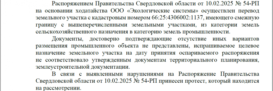 на основании ходатайства ООО «Экологические системы» участок с кадастровым номером 66:25:4306002:1137, граничащий с выбранным местом для полигона переведён из категории земель сельскохозяйственного назначения в категорию земель промышленности.