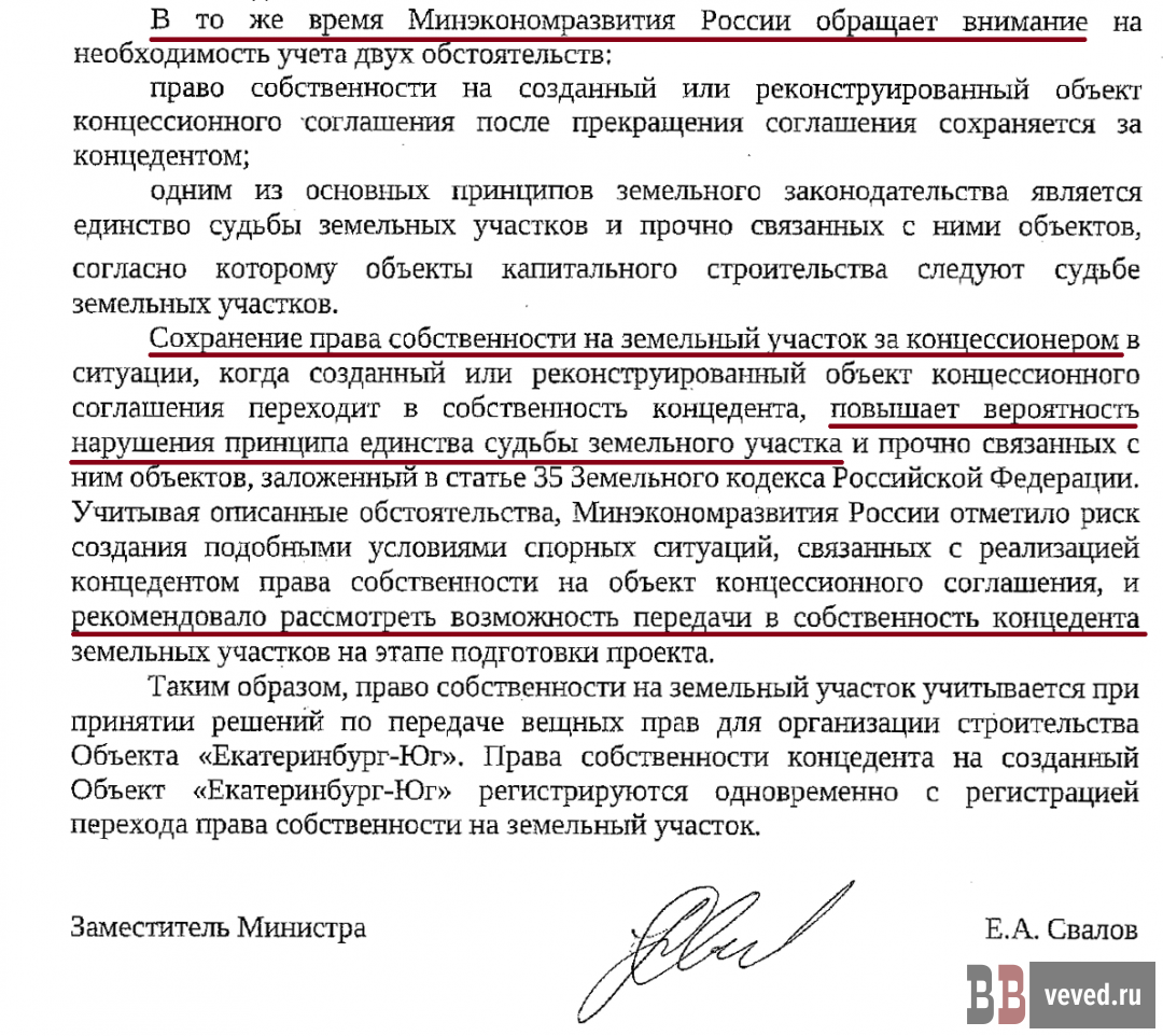 Однако в том же ответе замминистра областного ЖКХ Егор Свалов добавил, что Минэкономразвития рекомендовало передать права собственности на участок концеденту (которым выступает государство в лице правительства Свердловской области), объясняя это соблюдением «принципа единства судьбы земельного участка и прочно связанных с ним объектов».