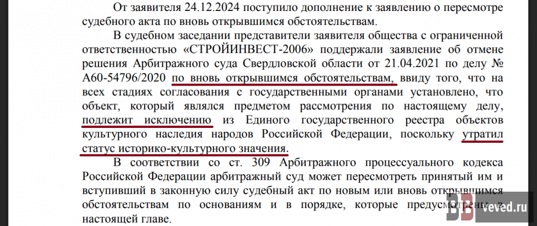 Примечательно, что исключение из реестра ОКН произошло на фоне длительного судебного процесса, продолжающегося с 2020 года — по иску Свердлохранкультуры, МУГИСО и лично министра культуры области Светланы Учайкиной арбитражный суд Свердловской области ещё в апреле 2021 году обязал собственника здания, ООО «Стройинвест-2006» провести противоаварийные работы, консервацию и затем реставрацию здания-памятника. Решение устояло в апелляционном, кассационном и Верховном суде. Однако в 2025 году производство по делу было возобновлено в связи с вновь открывшимися обстоятельствами (из-за процесса исключения из реестра ОКН), ближайшее заседание по делу назначено на 15 июля.