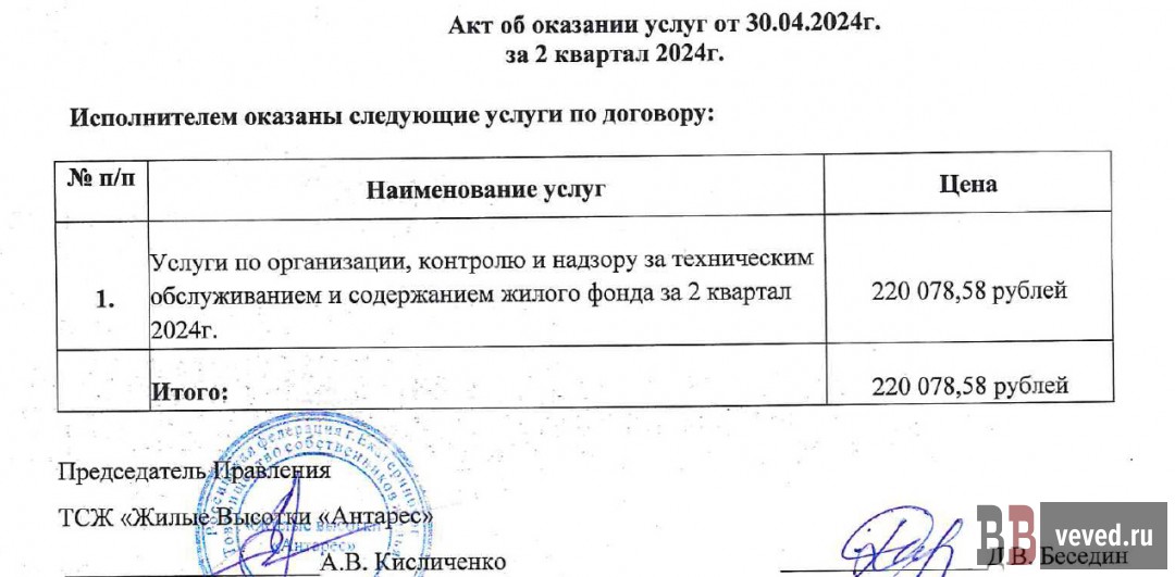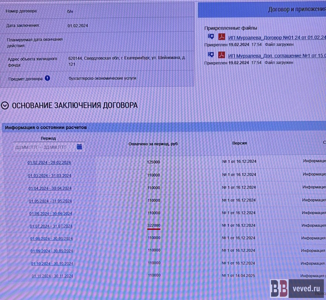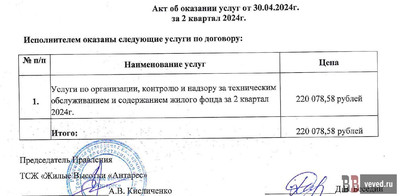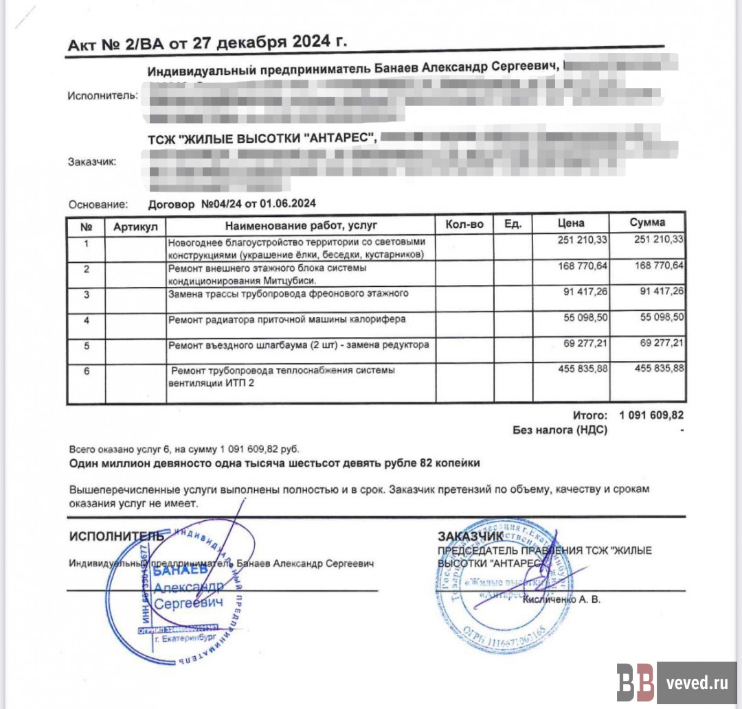 Многократная переплата по договору с ИП А.С.Б. Отдельное внимание жители обратили на договор ТСЖ с тем же ИП Банаевым А.С., заключённый в июне 2024 года для ремонта и обслуживания инженерных систем домов. Согласно самому договору, цена всех работ должна была составить около 284,8 тыс. рублей. Однако менее чем за год ТСЖ перечислило господину Б. в шесть раз больше – около 1,69 млн руб., причём второй платёж прошёл уже после окончания срока действия договора. Акты при этом были выложены не на всю сумму – на что потрачено 314 тысяч рублей на момент выхода материала правление ТСЖ не отчиталось. Более того, как утверждается в жалобе, фактически многие работы из этого договора могли выполнить штатные сотрудники ТСЖ или другие нанятые фирмы, то есть назначенный подрядчик мог получать деньги ни за что.