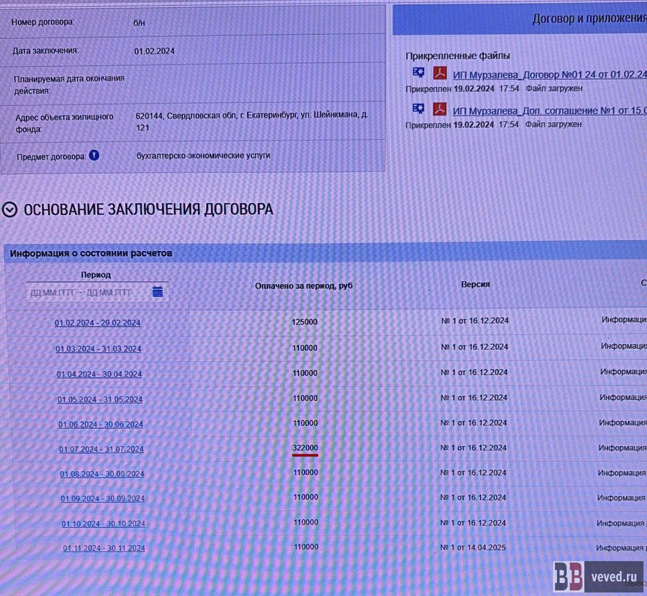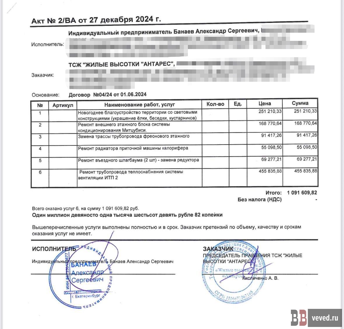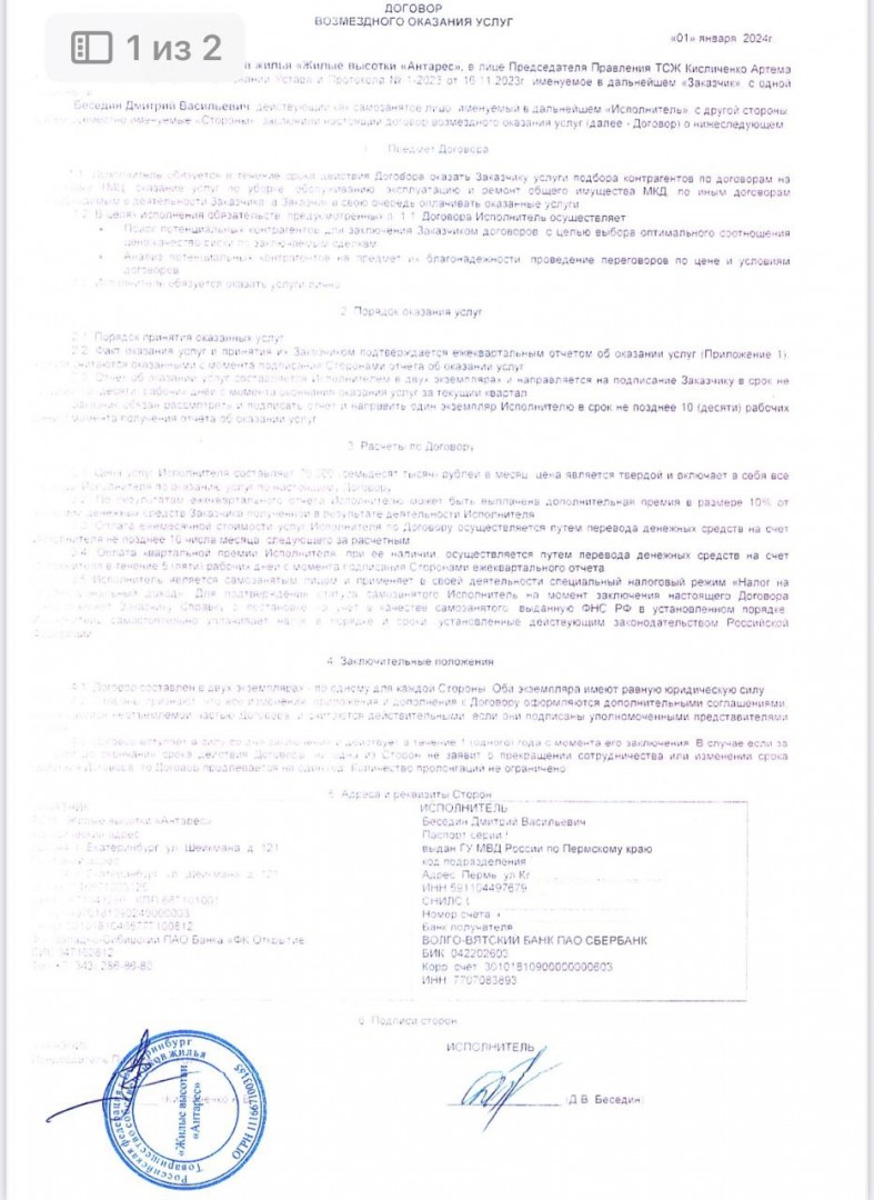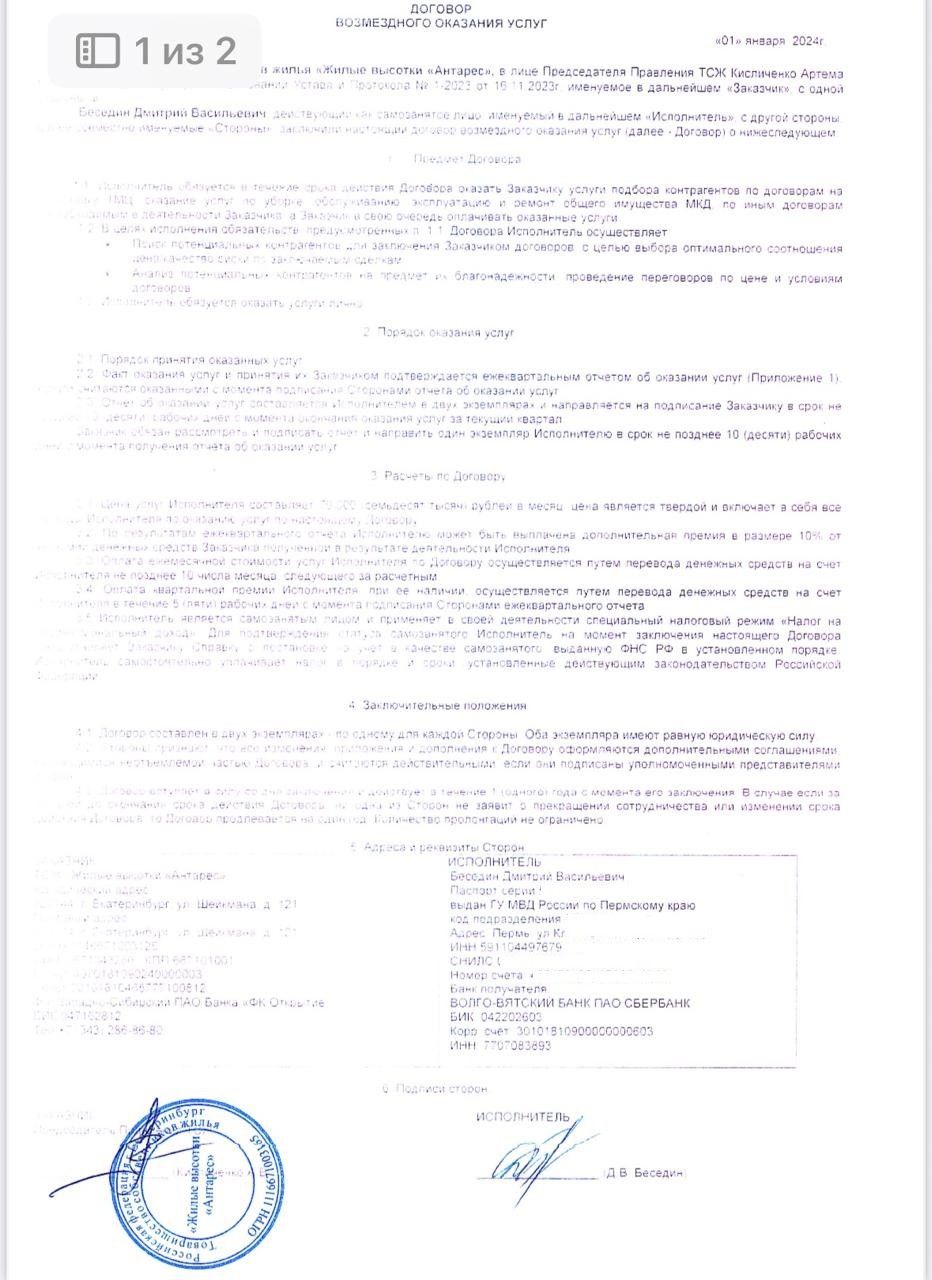 Многократная переплата по договору с ИП А.С.Б. Отдельное внимание жители обратили на договор ТСЖ с тем же ИП Банаевым А.С., заключённый в июне 2024 года для ремонта и обслуживания инженерных систем домов. Согласно самому договору, цена всех работ должна была составить около 284,8 тыс. рублей. Однако менее чем за год ТСЖ перечислило господину Б. в шесть раз больше – около 1,69 млн руб., причём второй платёж прошёл уже после окончания срока действия договора. Акты при этом были выложены не на всю сумму – на что потрачено 314 тысяч рублей на момент выхода материала правление ТСЖ не отчиталось. Более того, как утверждается в жалобе, фактически многие работы из этого договора могли выполнить штатные сотрудники ТСЖ или другие нанятые фирмы, то есть назначенный подрядчик мог получать деньги ни за что.